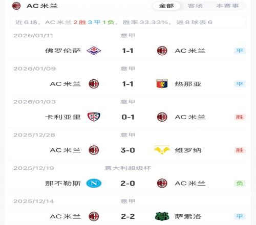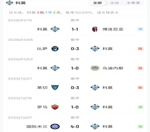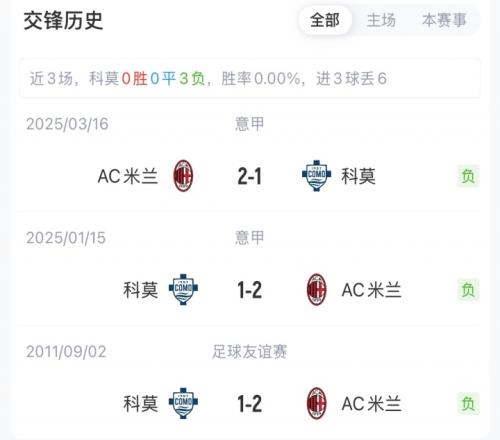 米兰暂以40分排名意甲第二,落后榜首6分。科莫34分暂排第六。