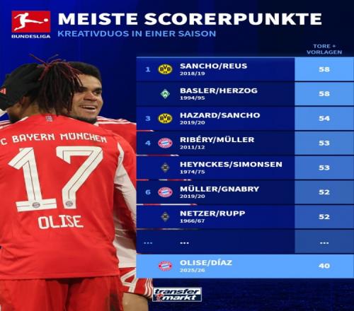 体育播报1月15日宣 奥利塞和迪亚斯在本赛季德甲的出色表现也引发了“新罗贝里”的讨论,《转会市场》数据统计显示迪亚斯+奥利塞半程直接参与40球是德甲边锋组合历史最高,距离单赛季纪录也仅差18球。
