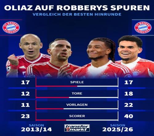 奥利塞和迪亚斯在本赛季德甲前17轮共计18球22助攻,直接参与40球。而罗本和里贝里表现最好的德甲上半程为13-14赛季,共计12球11助攻,仅参与23球。