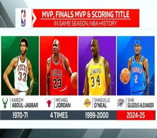 NBA单赛季双MVP+得分王球员:贾巴尔、乔丹、奥尼尔、亚历山大